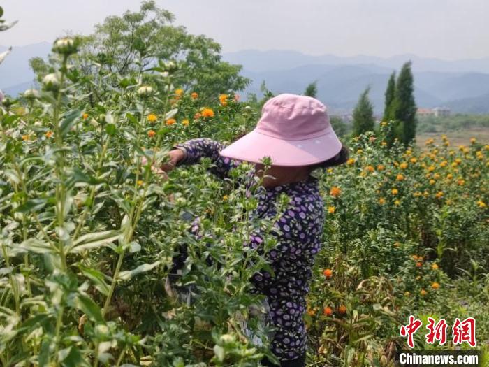 进入初夏,湖南茶陵县枣市镇侯泉村中药材种植基地内,金银花、红花等相继迎来收获季。