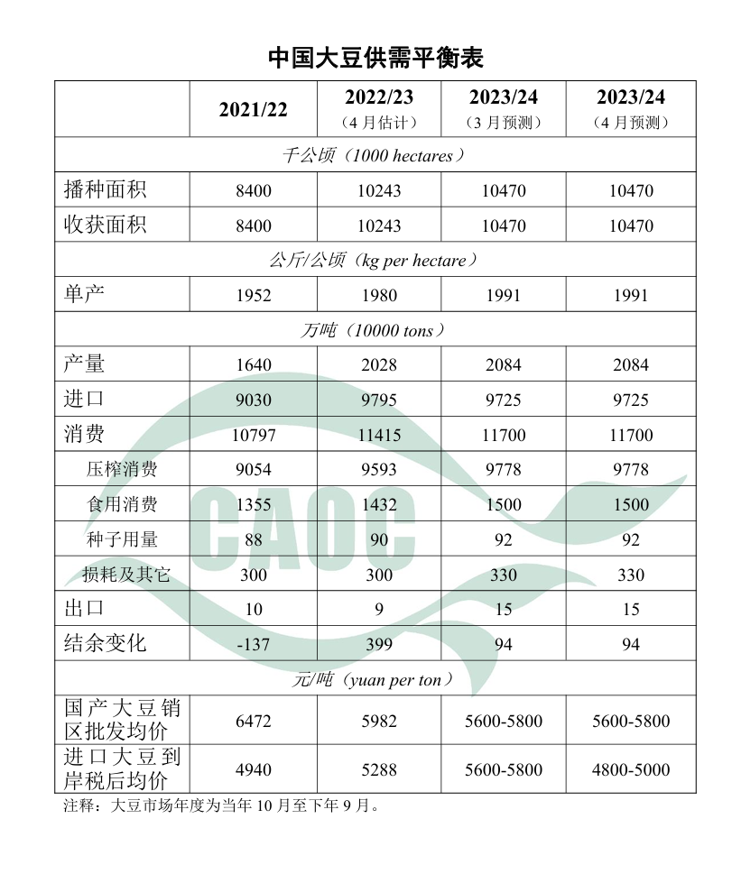 本月对2023/24年度中国大豆供需形势预测与上月保持一致。国内方面,当前春播正在由南向北有序展开,在一揽子稳定大豆生产政策支持下,农户种植意向有所好转。随着九三集团等持续收购,农户出售大豆进度明显加快,财盛证券价格平稳运行。国际方面,预计美国大豆库存和种植面积均高于上年度,南美丰产预期强烈,全球大豆供给维持宽松格局。